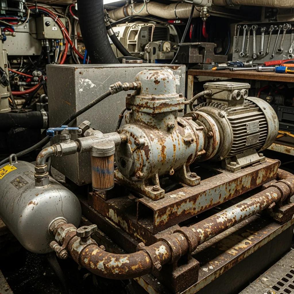 Traditional yacht compressor system showing wear and corrosion in a marine engine room